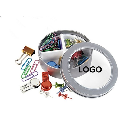 Keep yourself organized with our desktop stationery set. Includes: 30 paper clips, 15 pins, 4 binder clips, 4 colored plastic clips. 1" H x 3 1/2" Diameter. 1" H x 3 1/2" Diameter