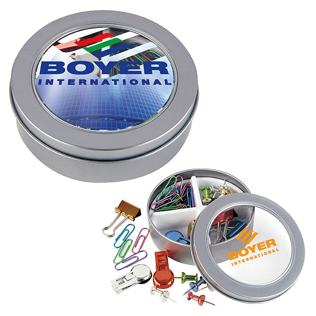 Keep yourself organized with our desktop stationery set. Includes: 30 paper clips, 15 pins, 4 binder clips, 4 colored plastic clips. 1" H x 3 1/2" Diameter