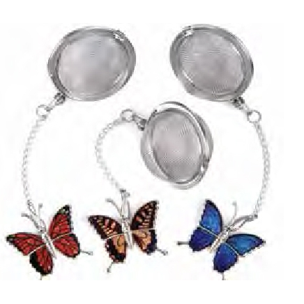 Quality stainless steel tea ball infusers with adorable jewel like butterfly ornament. Packed assorted 4 each of 3 butterfly designs. 12 per case with display rack. Attractive PVC packaging.