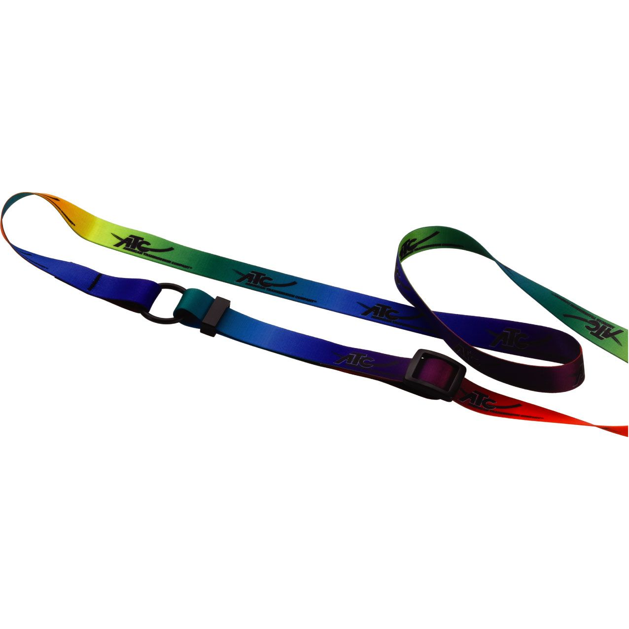 Recycled PET dye-sublimated/ adjustable water bottle strap. Made from 100% recycled post consumer water/soda bottles. Artwork will be reprinted on back side unless 'one side only' is requested. Backside imprint will not line up with the front side. Add 2 days if paper proof is requested. Pre production sample at no charge, must request on purchase order. Shipping not included. Add 5 business days to production if pre production sample is requested. 24" per side. 3/4" W x 48" L