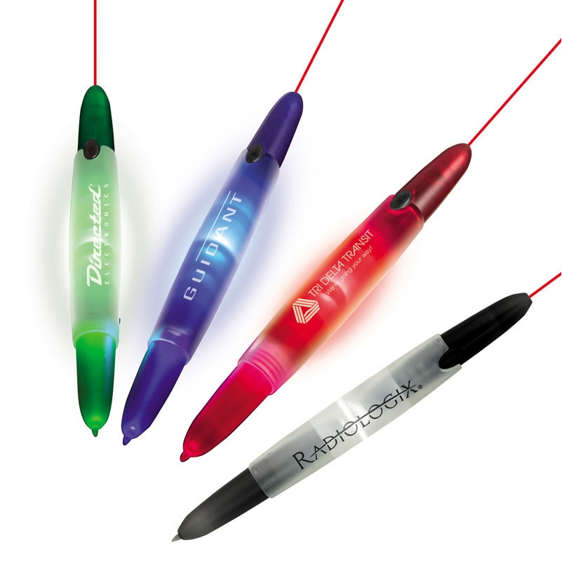 Ballpoint pen with laser pointer, LED light, non-capacitive stylus, large imprint area and includes 6 replacement batteries. This stylus will not work with touch screen devices. 3/4" W x 6" H x 3/4" D