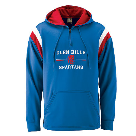Made with 100% polyester performance wicking fleece. Contrast color self-lined hood. Half-zip pullover style. Contrast color shoulder inserts. Set-in sleeves. Cover-stitched, self-fabric cuffs. Front pouch pocket. Open bottom. Double-needle hemmed bottom. Draw cord in hood on sizes Small and up. Available in adult sizes X-Small to 3X-Large.