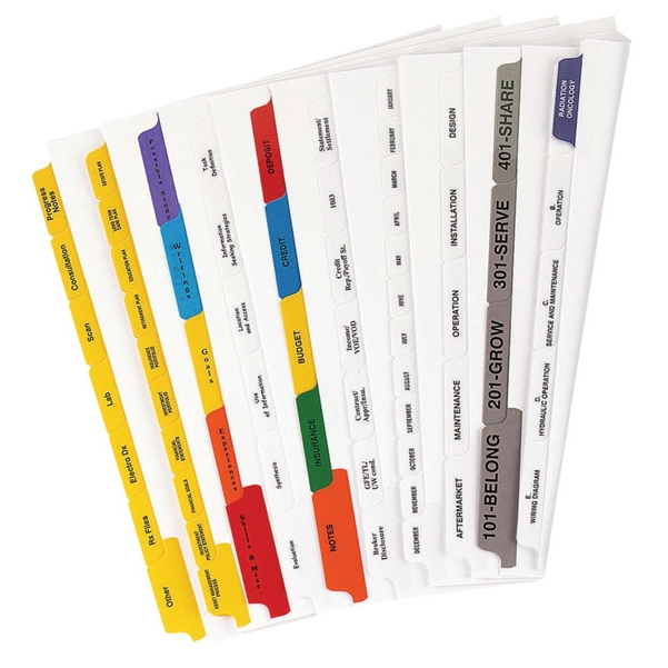 Mylar Tabs are a durable 90Lb white index stock with reinforced holes and includes tear protection edges. Fits all 11"x8.5" and 8.5"x5.5" three ring binders. Also includes typesetting on tabs (See Page 190 for available styles), maximum 2 lines of copy per tab, both sides, black ink. The tabs come with a choice of 4 tab copy positions and clear or colored Mylar. The tabs also extend 1/2" from the sheet edge. Each sheet tab size measures 0.90" per tab. 11" W x 8.5" H