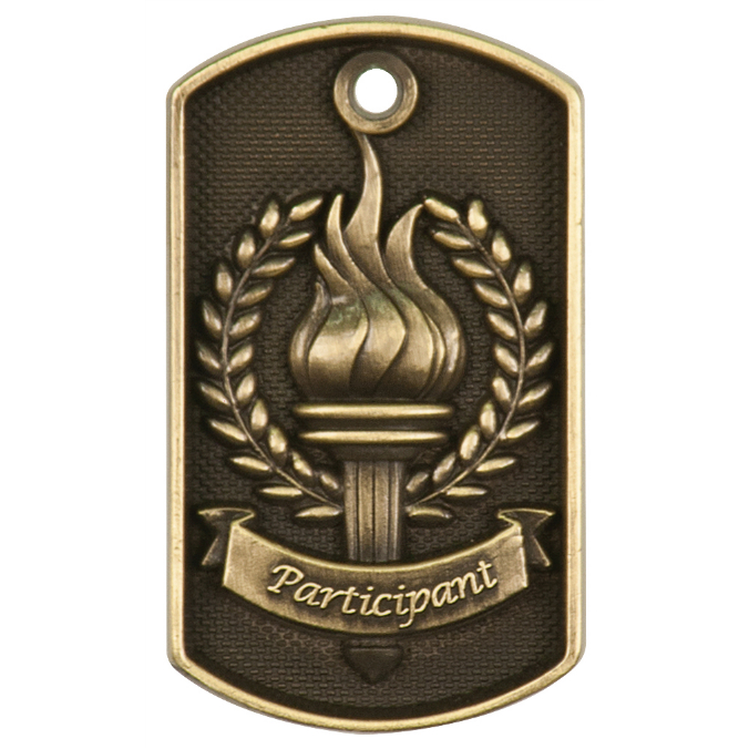 Participant 3-D 2" dog tag. Can be laser engraved at an additional price on back. Black Background with Sport insignia on the front. For Neck Ribbons See Cat. pages 1200-1206, for Presentation Boxes see Pages 600-601. For Neck Chains see Page 606. There is an additional charge for a Laser Engraved Flexibrass Inserts or a Full color Printed Vinyl Insert with a minimum of 10. 2" L x 1 1/8" W