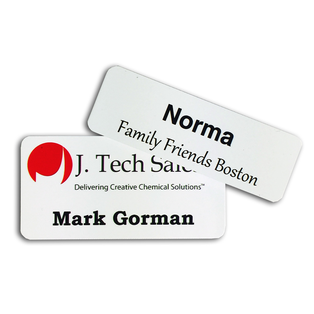 Make your logo stand out with our full color digital printed name badge and your brand look professional with USA Made badges. Digital printed badges, .060 (1/16") thickness, comes on variety of colored plastics like White, brushed silver, brushed gold, assorted custom colors and comes in different sizes. These digitally printed badges are easily personalized with no limits on lines or text. We can do PMS color match and full bleed printed.