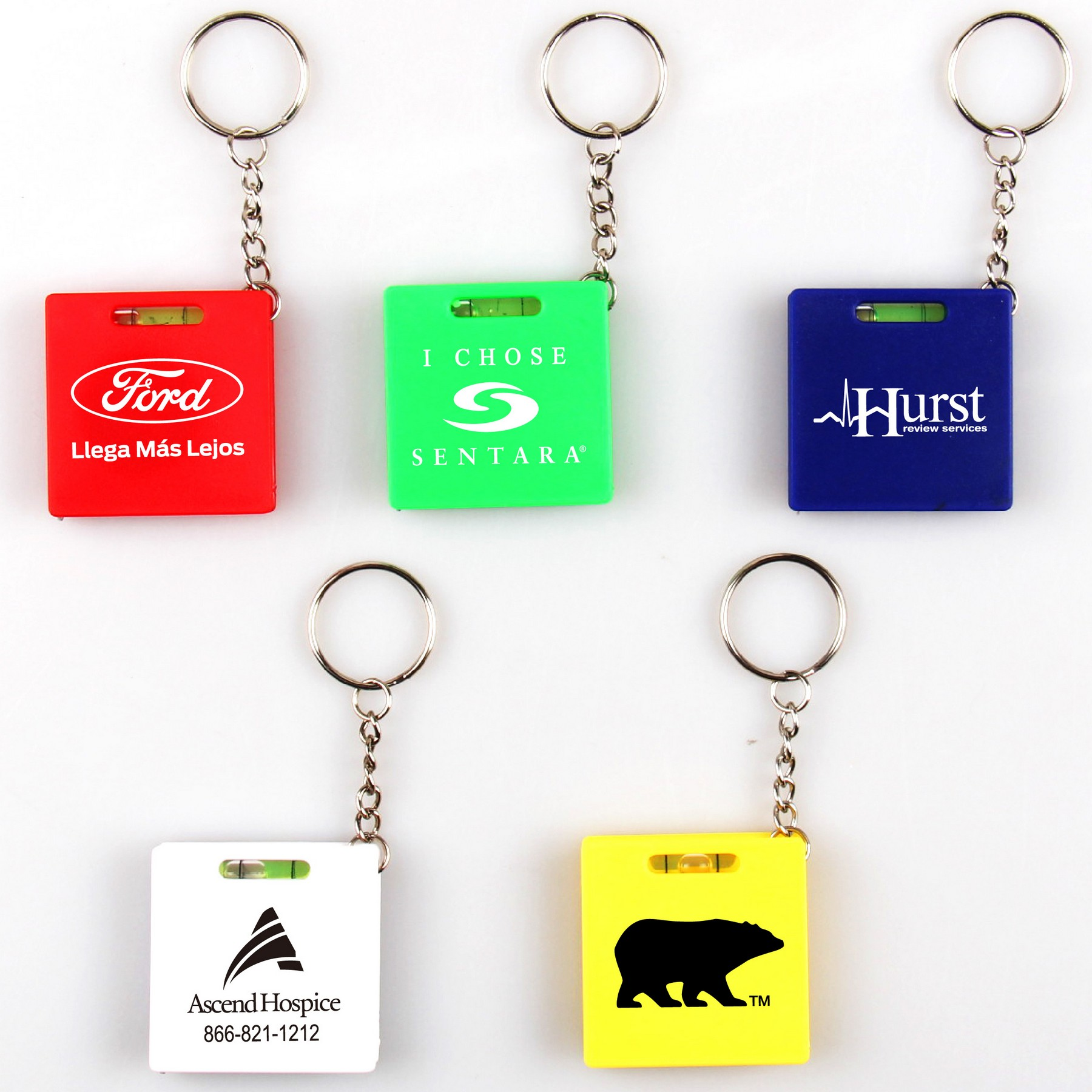 Square Tape Measure with level & key holder. Measure inches up to 39" and centimeters up to 100. Solid ABS case with metal tape. Large imprint area on both sides. Good for construction, real estate, tools, key tag, key chain, key ring, and travel. 1 5/8" L x 1 5/8" W