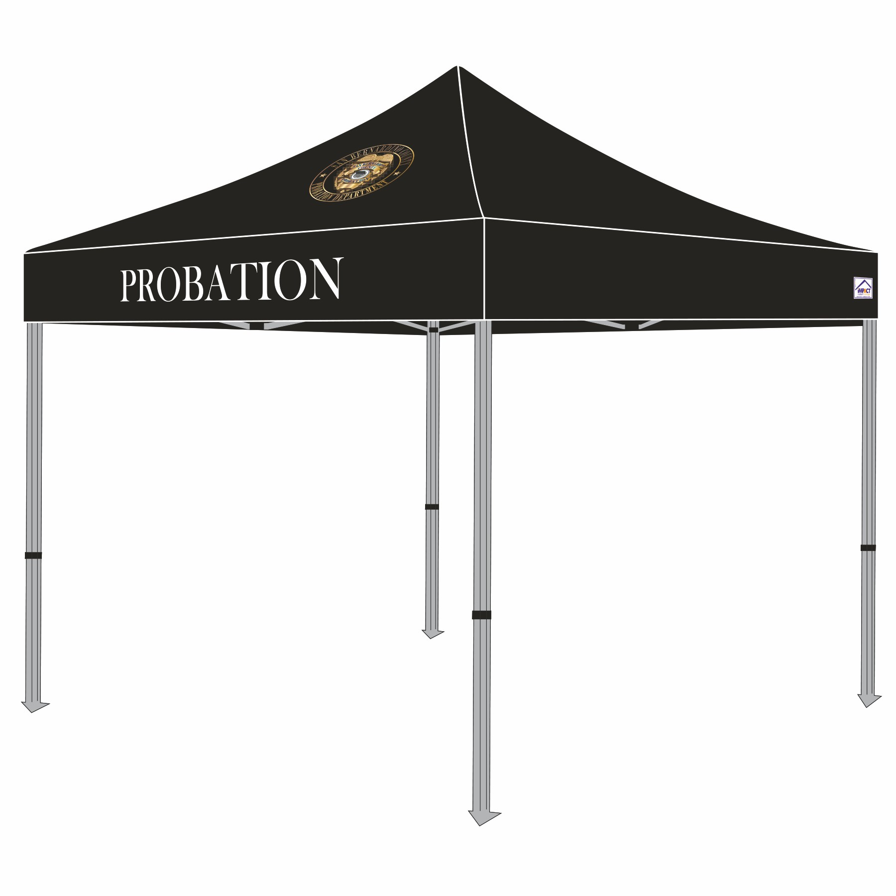 Your brand will pop among your competitors with this 10' x 10' canopy kit. This trade show necessity provides your customers with an easy way to locate where your business is placed among the crowds. Featuring a full color logo thermal printed on 2 locations, this customizable canopy top is paired with our economy steel TL 10' x 10' frame. Dust cover and rope & spike kit are also included. Customize this canopy and order today!. Complies with CPAI-84, NFPA. 10' L x 10' W
