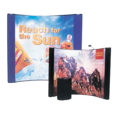 Comes with complete trade show kit including collapsible frame. 3 or 4 plastic front panels and 2 plastic end panels. Magnetic mounting, 2 halogen lights, and a sturdy carrying case on wheels which can convert to a Podium. 10' W x 7.7' H