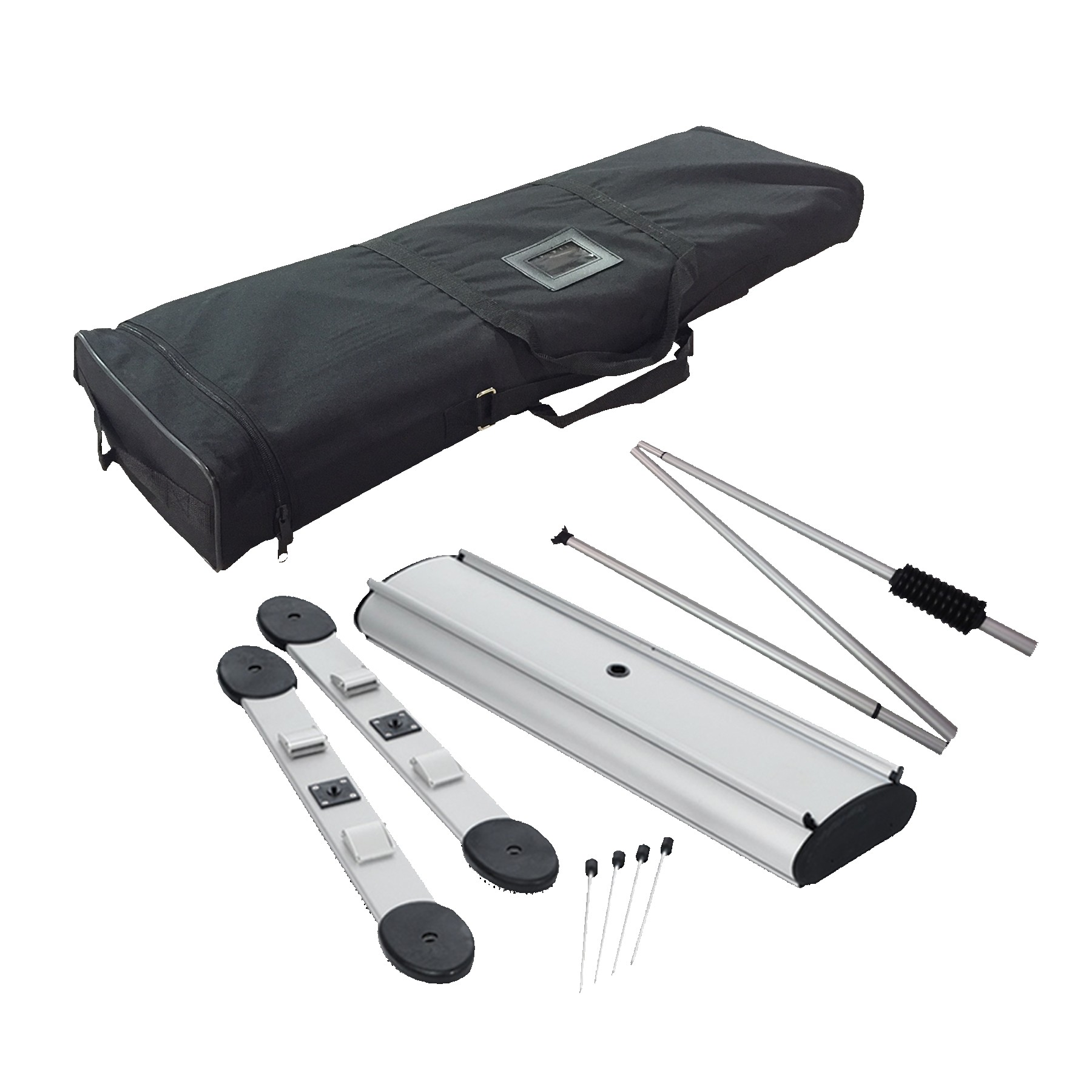The switchblade is a double sided stand that has a sleek silver base and a wonderfully thought out compact design. Easy to assemble, this stand has a snap top graphic rail that makes adding your graphic to it super easy! The stand can hold two single sided prints and comes with a 3-piece bungee pole set with swivel out feet. Print sold separately. 82" H x 36" W x 12" D