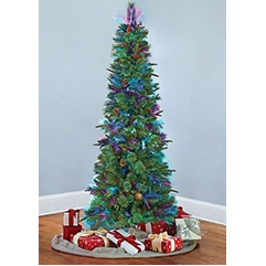 This is the 4' tabletop tree with fiber optic needles that produce multicolored twinkling light. The 4'-tall tree has 300 PE/PVC fiber optic tips that seamlessly change color to produce red, green, blue, yellow, and white shimmering light, fed by a revolving halogen lamp housed in the 81/2"-diam. base. Decorated with 19 pine cones and 19 red berry clusters, the 2-ply fiber optic strands are tucked among lifelike spruce branch tips that recreate the lush greenery of the classic evergreen. 48" H x 22" Diameter