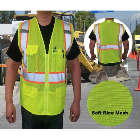 ANSI/ISEA 107-2010 Safety Vest Class 2 Compliant Feature: 120 gsm Rice Mesh Front and Mesh Back Front Right Chest Pockets with Velcro Top Closure (fits cell phones) Left and Right Side Mic-Tab Front Left Chest 2 Layered pockets with Pen Divider 2 Bottom Pockets, Zipper Up Front 2" Grey Reflective Stripes with Orange Contrast Binding Color: Neon Green/Yellow with Orange Contrast Size: S - 5XL. Complies with ANSI, EN471.