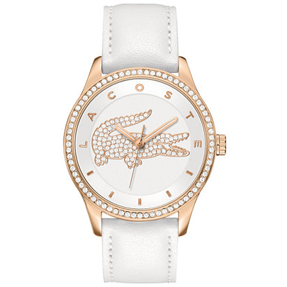 Timepiece, Women, Woman, Lady, Lacoste, Textured Dial, Stainless Steel Case, Rose Gold Tone Plating, Leather Strap, Swarovski Crystal Bezel, Water Resistant, Round Dial. Complies with Prop 65, RoHS. 40.0mm W