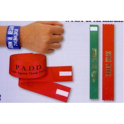 Wristbands are made from premium satin ribbon with a 1 color foil imprint. Measuring 1" x 6" for small wrists and 1" x 8" for larger wrists with double sided tape for attachment. 1" W x 8" L